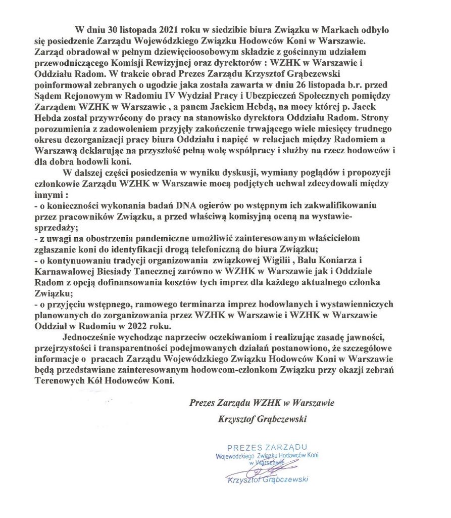 Informacja Prezesa WZHK Warszawa Pana Krzysztofa Grąbczewskiego o pracy z posiedzenia ostatniego Zarządu
