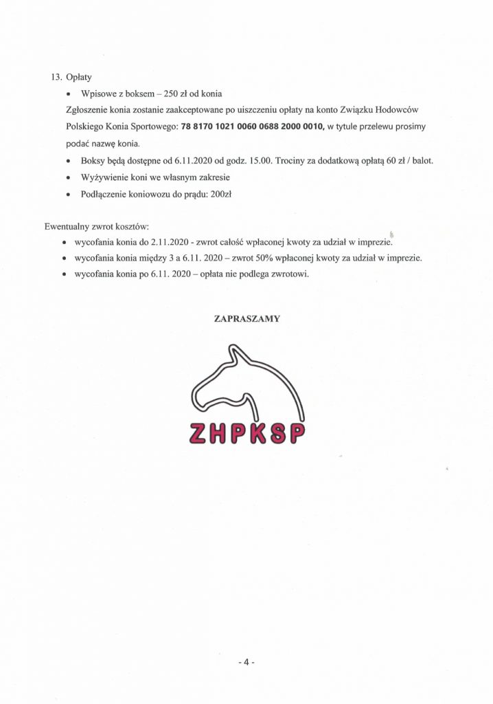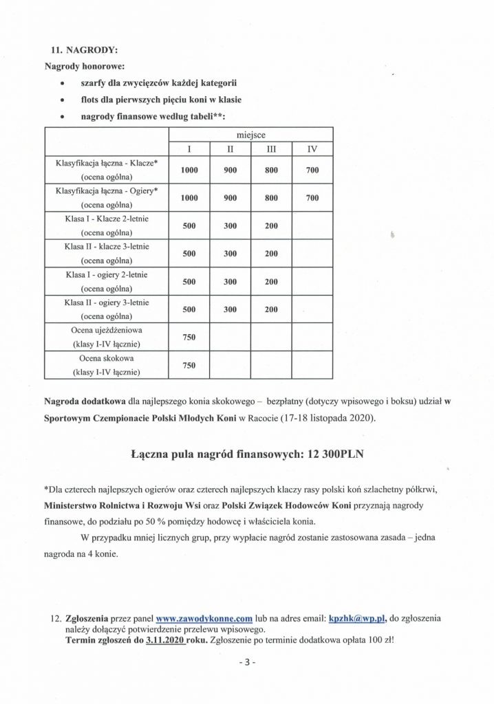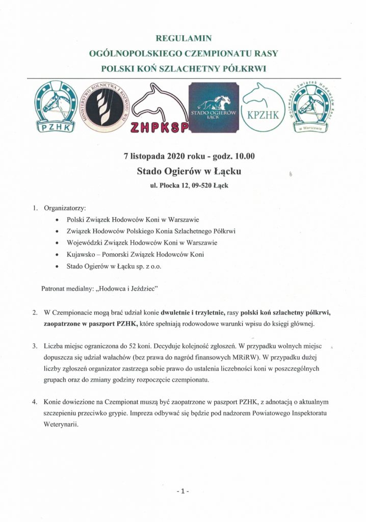 Informujemy, iż w dniu 7 listopada 2020 na terenie Stada Ogierów w Łącku odbędzie się Ogólnopolski Czempionat Rasy Polski Koń Szlachetny Półkrwi. Serdecznie zapraszamy do zapoznania się z regulaminem i zasadami zgłoszeń. Zgłoszenia przyjmuje Kujawsko-Pomorski Związek Hodowców Koni w Bydgoszczy. Prosimy pisać na adres: kpzhk@wp.pl. W treści wiadomości należy wpisać, że jest to zgłoszenie na Czempionat SP, nazwa, numer identyfikacyjny konia i dane właściciela z nr tel. kontakt. Należy dołączyć potwierdzenie przelewu wpisowego.
